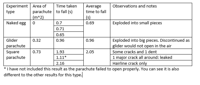 If I subtract one from the other I can say that the left-over force on my egg was 2.92N. This still made enough impact force to make a crack but not enough to smash the eggs when they had their parachutes on.